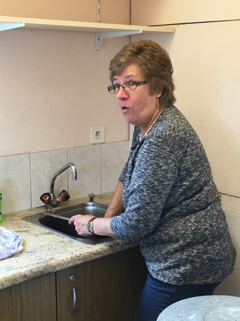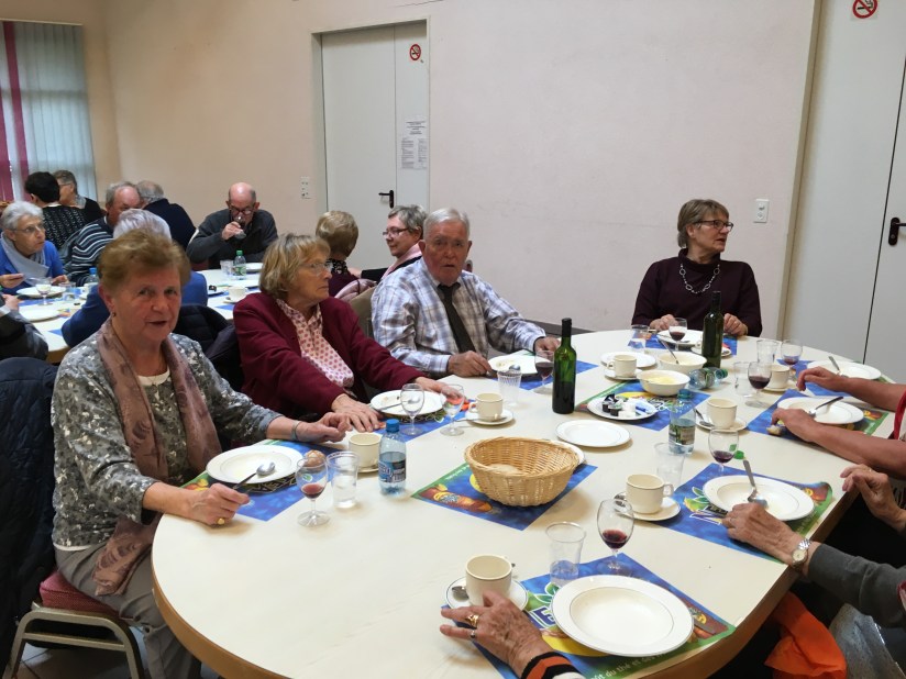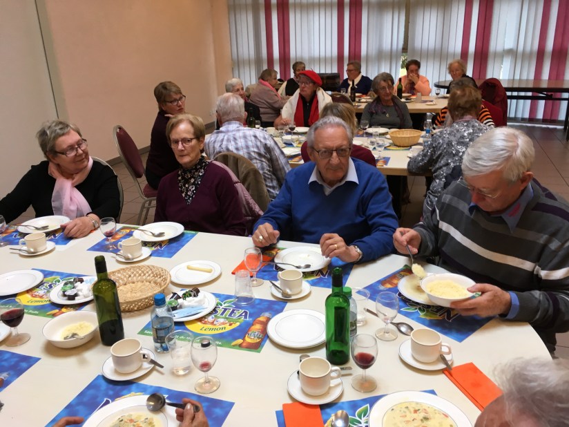 Le soir au souper à l’hôtel on profite de fêter une pèlerine avec un gâteau et un verre de porto pour son anniversaire ,par la même occasion nous remettons au personnel le fruit de la collecte pour leur amabilité et leur bon service.