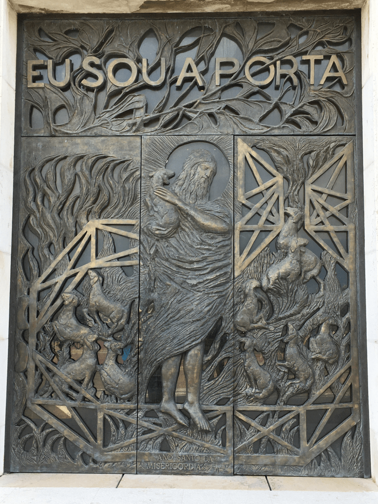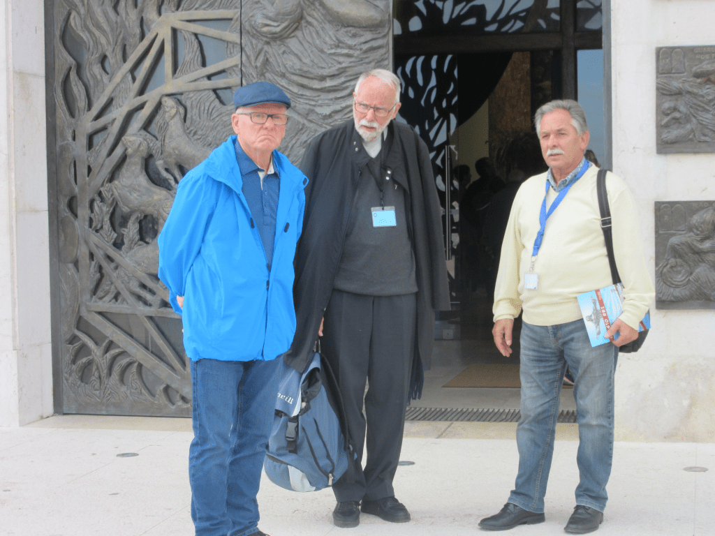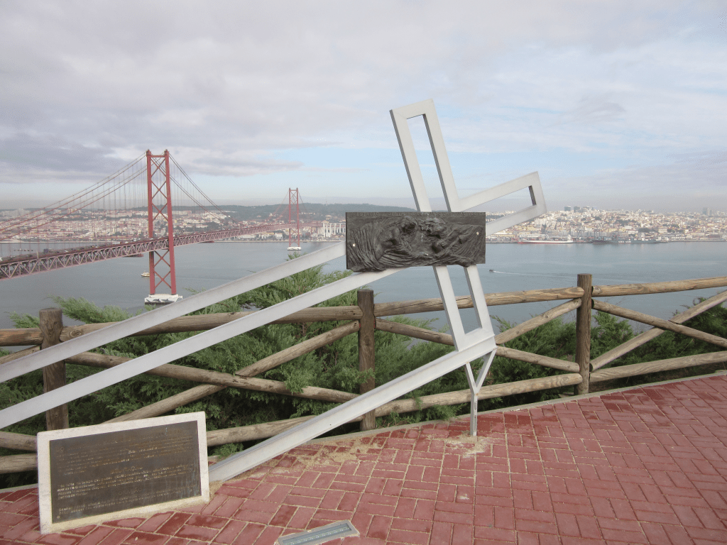 Pont Vasco de GamaPont du 24 AvrilVue de l’esplanade du sanctuaire sur le pont du 24 avril et Lisbonne.Sanctuaire du Christ Roi – Il est un sanctuaire et monument religieux représentant le Sacré-Coeur de Jésus. Surplombant le pont du 24 avril , il fait face à la ville de Lisbonne par rapport à l’embouchure du Tage. Ce monument, mesure lui-même 110 mètres . Il est constitué de deux parties : La première est un portique de 82 mètres de hauteur, construit par l’architecte Antonio Lino. La deuxième est la statue du Christ de 28 mètres de haut, les bras ouverts, tourné vers la capitale portugaise, œuvre du sculpteur Francisco Franco de Sousa. Son poids est de 40 000 tonnes, la taille de la tête est de 4,05 m et les bras mesurent 10 m de longueur. L’envergure entre les deux mains est de 28 mètres Christ Roi. Porte d’entrée de la chapelle du Christ RoiFronton, au dessus de la porteDevant la porte de la chapelle, de gauche à droite: Marc Chammartin, secrétaire du CRAMF, Michel Suchet, directeur spirituelle du pèlerinage et Bruno Marchello, président du CRAMFMesse à la chapelle du Christ Roi à Lisbonne, célébrée par l’Abbé Michel SuchetRemontée dans le bus de notre sympathique chauffeur Joao, pour se rendre à l’aéroport de Lisbonne.