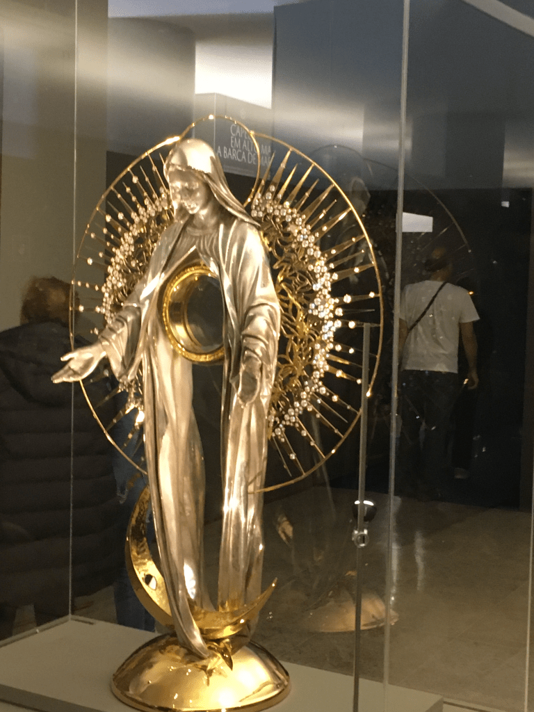 Ostensoir en or fondu, argent doré fondu et recoupé; verre; gemmes enchâssées (rayon); argent ciselé , battu et recoupé; fragments de météorites et fragments de pierres du sol lunaire.Couronne du trône du retable de la basilique de notre dame du rosaire de Fatima – orfèvrerie Alliança 1953, argent fondé, soudé et ciselé, velours.Notre-Dame de Fatima – Copie de faïence du pan est de la petite chapelle des apparition – Carlos Ramiro (peintre), Cerâmica de Becesse (atelier) 2007