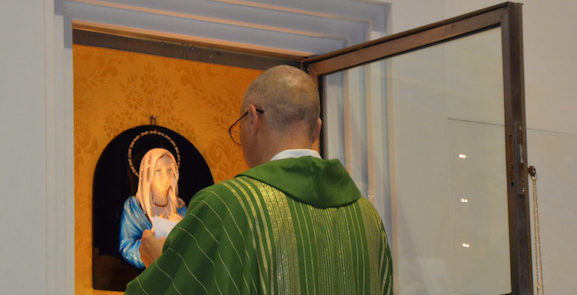 Prions : Je vous salue, Marie pleine de grâce ; le Seigneur est avec vous. Vous êtes bénie entre toutes les femmes et Jésus, le fruit de vos entrailles, est béni. Sainte Marie, Mère de Dieu, priez pour nous pauvres pécheurs, maintenant et à l’heure de notre mort. Amen.