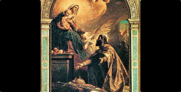 | Il existe plusieurs peintures d’autel représentant le roi saint Étienne de Hongrie offrant la couronne de Hongrie à la Vierge Marie dans différentes églises de Hongrie et des pays voisins (en effet, jusqu’en 1920, celles-ci appartenaient au Royaume de Hongrie). Depuis le 11è siècle, la Vierge Marie y est honorée comme Patrona Hungariae (Patronne de la Hongrie). Les catholiques hongrois sont profondément convaincus que leur pays n’aurait pas pu traverser le dernier millénaire sans les soins attentionnés de leur patronne.Le premier roi de Hongrie, saint Étienne (né en 975), fut baptisé par l’évêque saint Adalbert de Prague en 985. Il fonda le Royaume de Hongrie, créant ainsi un pays de style occidental bien organisé et pouvant défendre son indépendance. Très dévoué à la Vierge Marie, Étienne fit construire plusieurs églises en son honneur. La souffrance ne fut pas absente de la vie du roi : il perdit plusieurs enfants en bas âge et un seul atteignit l’âge adulte, Emerick. Ce seul fils survivant reçut une solide éducation catholique et devait succéder à son père, mais mourut malheureusement dans un accident de chasse en 1031, et ne régna pas.Les dernières années du roi furent marquées par la maladie et par un conflit de succession entre ses proches. En 1038, lors de la fête de l’Assomption de la Vierge Marie, Étienne adressa ses dernières paroles aux dirigeants de l’Église et de l’État, leur demandant de protéger et de répandre la foi catholique. Le roi adressa l’une de ses dernières prières à la Vierge Marie : « A toi, reine des cieux et à ta tutelle, je recommande la Sainte Eglise, tous les évêques et le clergé, tout le royaume, ses dirigeants et ses habitants ; mais avant tout, je confie mon âme à tes soins. » Saint Étienne de Hongrie est décédé le 15 août 1038. Il fut enterré aux côtés de son fils, Saint Emerick, et les deux furent canonisés ensemble en 1083. |