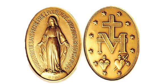 Enfin le tableau se retourne et Catherine voit le revers de la médaille: en haut une croix surmonte l’initiale de Marie, en bas deux cœurs, l’un couronné d’épines, l’autre transpercé d’un glaive. Une parole semble fondamentale « avec confiance ». La médaille a été distribuée aux pauvres par Catherine Labouré et les prodiges qui ont suivi la diffusion de cette prière dont la médaille est un « support », l’ont fait appeler « médaille miraculeuse ». Mais, comme l’expriment les deux cœurs incisés sur la médaille, ce qui est miraculeux, c’est l’amour.