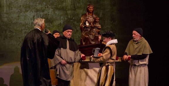 « L’Etonnante histoire de Boulogne-sur-mer » (Nord de la France) est un grand spectacle historique retraçant les 1500 ans de la ville de Boulogne à travers l’histoire de la Vierge. Croyants ou pas, 300 bénévoles s’y investissent chaque année avec des professionnels du spectacle. C’est très vivant, dynamique, parfois drôle mais aussi dramatique ou très émouvant quand la statue de Marie passe au milieu des spectateurs. Car alors tout s’apaise, un cantique s’échappe sous les voûtes, Marie avance, portée par quatre marins et sur leurs visages se devine toute l’émotion qu’ils ressentent.