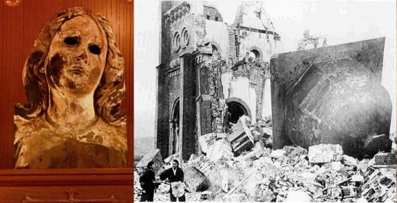 Quand le buste a été retrouvé, le visage de la Vierge était irrémédiablement endommagé, les orbites vides, les joues et les cheveux carbonisés, avec une fissure sur le côté gauche du visage qui, selon certains, ressemble maintenant aux larmes de la Mère de Dieu.