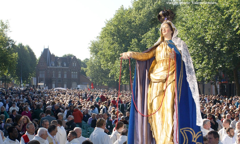 En 1008, Valenciennes (France) est ravagée par une épidémie de peste. Un ermite supplie et s’offre. Il reçoit un message annonçant une apparition prochaine ; les habitants sont conviés sur les remparts, et, dans la nuit du 7 au 8 septembre, la Vierge se montre aux habitants et deux anges déroulent un cordon autour de la cité. La Vierge promet de mettre fin à l’épidémie si une procession est organisée le lendemain puis chaque 8 septembre. (La procession annuelle est encore pratiquée avec ferveur, pour la protection des pestes modernes, celle de l’individualisme par exemple.)