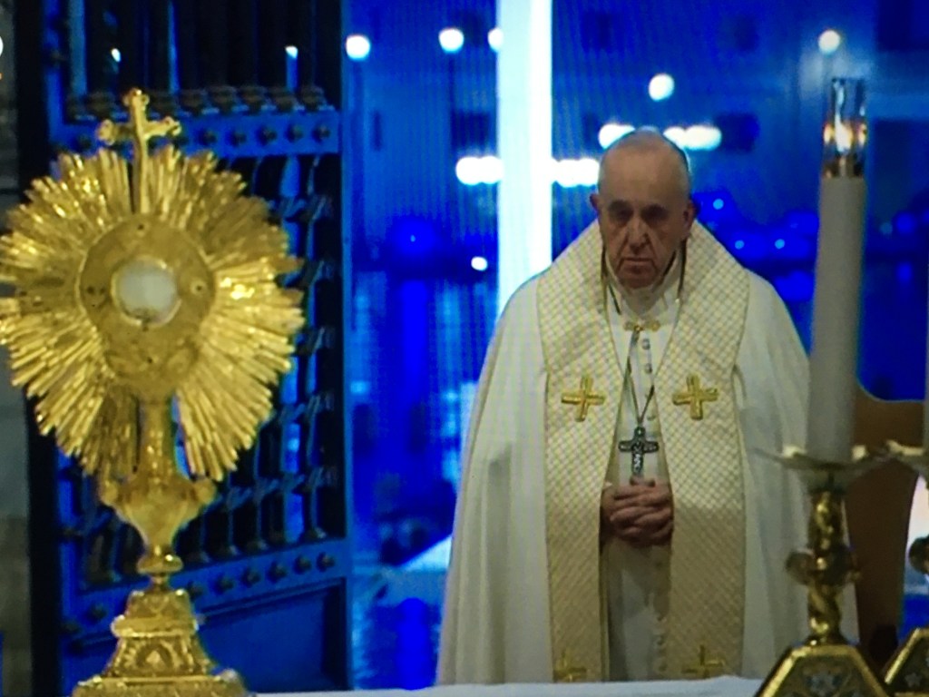 L’adoration du Saint-Sacrement exposé sur l’autel, enveloppé d’encens, était rythmé par une prière de supplication pour demander au Seigneur de sauver l’humanité, et dont voici une traduction en français: