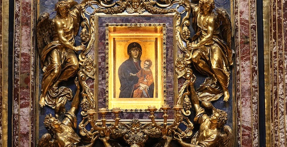 Le premier fait référence à l’icône Salus Populi Romani de la Vierge à l’Enfant. Certaines traditions religieuses rapportent que cette icône de grande taille (1,5 m sur 1 m) aurait été réalisée par saint Luc, avant même l’écriture des Évangiles, sur du bois provenant d’une table que Jésus aurait lui-même construite. Saint Luc l’aurait peinte tout en écoutant Marie lui parler des détails de sa vie. Bien que les historiens pensent aujourd’hui que l’icône ne remonte pas au premier siècle, elle reste néanmoins liée aux premiers temps de l’Eglise. Elle est exposée dans la chapelle Paolina de la basilique Sainte-Marie-Majeure, près de la crypte qui contiendrait du bois provenant de la vraie crèche du Christ à Bethléem.