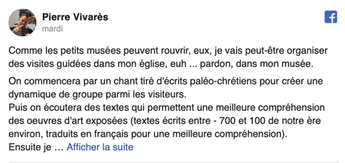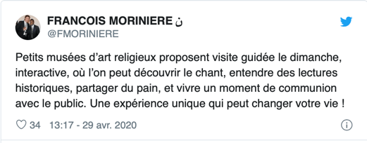 Sur les réseaux sociaux, il est bien sûr question de célébrer des messes à domicile. Beaucoup d’internautes rivalisent d’imagination. Certains suggèrent ainsi d’organiser des visites guidées dans les lieux de culte – qui feraient dans ce cas offices de petits musées, puisque ceux-ci sont autorisés à ouvrir. Le père Pierre Vivarès, curé de Saint-Paul Saint-Louis (Paris), imagine une visite avec lectures de textes anciens et « collation simple dans le strict respect des gestes barrières ». « Bien sûr, en ces temps de crise, la participation financière pour cette visite sera laissée à la discrétion des personnes présentes », conclue-t-il avec humour.