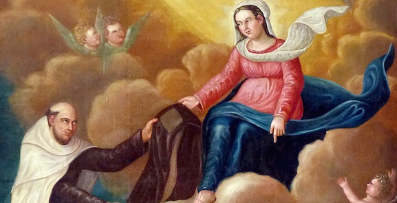 En 1247, le général de l’Ordre du Carmel s’appelait Simon Stock, et il suppliait Marie, invoquée comme « Fleur du Carmel », ou « Étoile de la mer », de l’aider dans les difficultés institutionnelles du moment. C’est alors que le 16 juillet 1251, Marie apparaît à Simon Stock, accompagnée d’une multitude d’anges et lui dit, en lui  présentant le scapulaire : « Voici le privilège que je donne à toi et à tous les enfants du Carmel. Quiconque meurt revêtu de cet habit sera sauvé. »