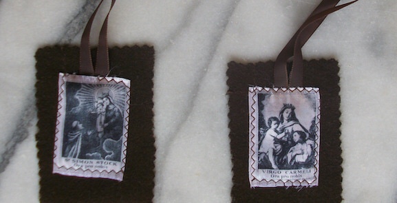 Le mot « scapulaire » vient du latin scapulae qui signifie épaules. Le scapulaire est une longue bande d’étoffe couvrant les épaules, souvent munie d’un capuchon et descendant jusqu’aux pieds devant et derrière. La plupart des religieux le portent sur leur tunique. Le scapulaire du Mont-Carmel qui en est une réduction, est composé de deux morceaux de laine tissée brune, de forme rectangulaire ou carrée, reliés entre eux par deux fils de manière à pouvoir être portés, un morceau sur la poitrine et l’autre sur le dos. Une pieuse coutume, non impérative, y place en plus une image de la Sainte Vierge.