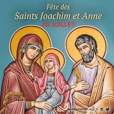 Anne et Joachim sont les parents de la Vierge Marie est présentée dans les évangiles comme une jeune fille de Nazareth, fiancée de Joseph dont les ascendants sont longuement énumérés dans la généalogie du Seigneur. Mais dans les quatre évangiles, qui sont entièrement tournés vers la Bonne Nouvelle du Christ, dans sa vie, ses paroles et sa Résurrection, nulle mention de sa famille à elle, sans doute fixée aussi à Nazareth. La tradition, dès les premiers siècles, appellent les parents de la Vierge Marie, Joachim (« Dieu accorde ») et Anne (« La gracieuse »). L’imagination des auteurs des évangiles apocryphes en fait un couple discret mais bien réel, car il a su accueillir, éduquer Marie et l’éveiller dans la grâce toute spéciale qui était la sienne, et qu’ils ignoraient. Le culte de sainte Anne apparaît dès le 6ème siècle dans certaines liturgies orientales, et au 8ème siècle dans les liturgies d’Occident. Son culte est généralisé avant la fin du 14ème siècle. Sainte Anne est souvent représentée apprenant à lire à sa fille dans le texte de la Bible. Une icône russe, image gracieuse de l’amour conjugal, immortalise le baiser qu’ils se donnèrent lorsqu’ils apprirent la naissance de Marie. C’est ainsi qu’ils ont participé au mystère de l’Incarnation. La Bretagne, à la suite de la découverte d’une statue miraculeuse, non loin de Sainte-Anne d’Auray, en a fait sa « patronne ». Les marins par le fait même l’ont choisie comme protectrice.