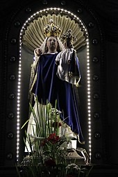 D’après la tradition, des bûcherons auraient entendu des Anges chanter l’Ave Maria en ce lieu et ils auraient trouvé une statue de Marie, au pied d’un chêne, non loin d’une source.