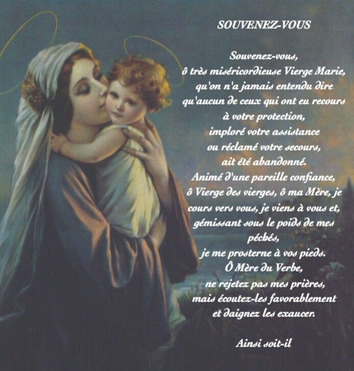 « Souvenez-vous, ô Très miséricordieuse Vierge Marie, qu’on n’a jamais entendu dire qu’aucun de ceux qui ont eu recours à votre protection, imploré votre assistance ou réclamé vos suffrages, ait été abandonné. Animé de cette confiance, ô Vierge des vierges, ô ma Mère, je viens vers vous, et gémissant sous le poids de mes péchés, je me prosterne à vos pieds. Ô Mère du Verbe Incarné, ne méprisez pas mes prières, mais écoutez-les favorablement et daignez les exaucer. Amen. »