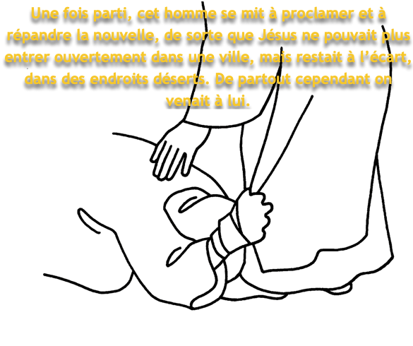 Une fois parti, cet homme se mit à proclamer et à répandre la nouvelle, de sorte que Jésus ne pouvait plus entrer ouvertement dans une ville, mais restait à l’écart, dans des endroits déserts. De partout cependant on venait à lui.