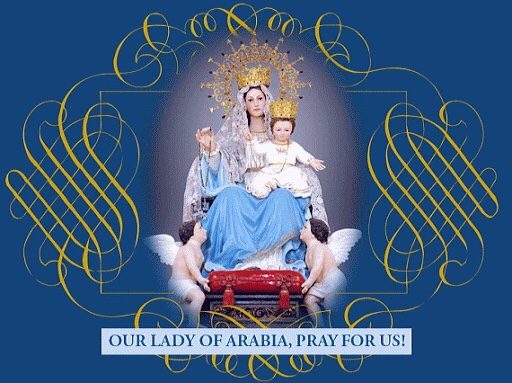 Il n’est pas surprenant que dans cette partie du monde qu’est la péninsule arabique, les catholiques désirent exalter la dignité de reine de Marie. Le titre de « Notre-Dame d’Arabie » (ou « Reine d’Arabie »), qui pourrait sembler récent, a pourtant été approuvé en 1948 par le Révérendissime Administrateur Apostolique d’Arabie. Ce titre était destiné à accomplir la prophétie de la Sainte Vierge contenue dans le Magnificat : « Voici que désormais toutes les générations me diront bienheureuse ! » (Luc 1:48)