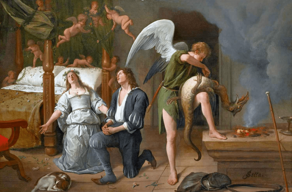 Et Raphaël fut envoyé pour les guérir tous deux : à Tobith pour enlever le voile blanchâtre qui couvrait ses yeux afin que, de ses yeux, il voie la lumière de Dieu, et à Sarra, fille de Ragouël, pour la donner en mariage à Tobie, fils de Tobith, et expulser d’elle Asmodée, le pire des démons ; en effet c’est à Tobie que revenait le droit de l’épouser plutôt qu’à tous ses prétendants.