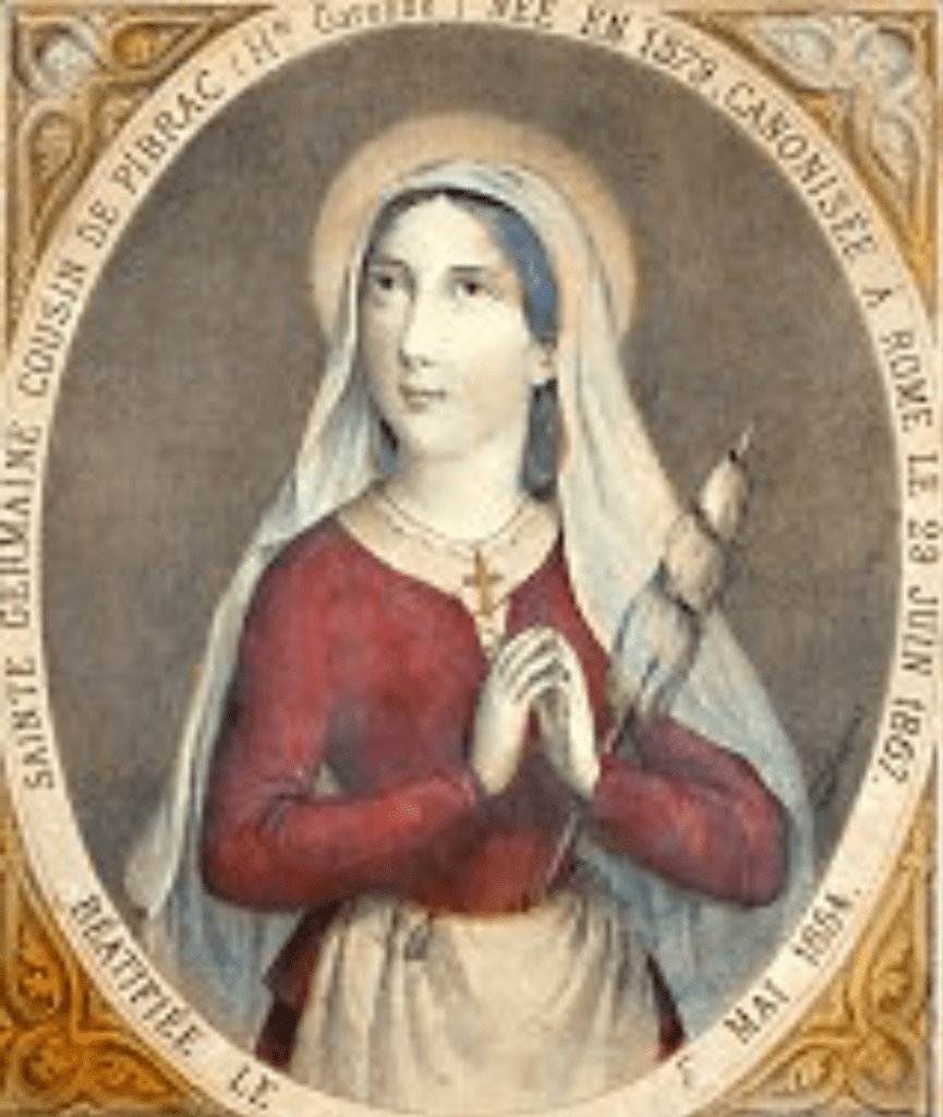 Germaine Cousin naît à Pibrac, non loin de Toulouse. Sa courte vie de vingt-deux ans est une merveille de la grâce. Fille d’un pauvre laboureur, percluse de la main droite, scrofuleuse, elle fut, pour comble de malheur, privée de sa mère, à peine sortie du berceau. La petite orpheline devint l’objet de la haine et du mépris d’une belle-mère acariâtre et sans cœur ; la douleur, née avec elle, devait être sa compagne jusqu’à la mort. Cette pauvre ignorante fut instruite par Dieu même dans la science de la prière.