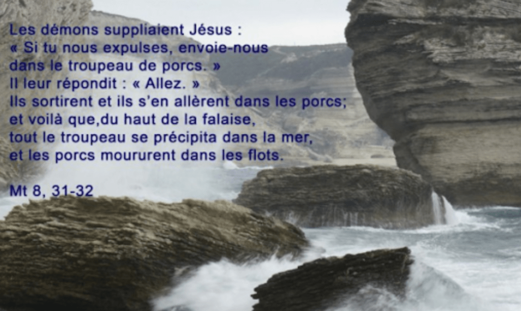 Il leur répondit : « Allez. » Ils sortirent et ils s’en allèrent dans les porcs ; et voilà que, du haut de la falaise, tout le troupeau se précipita dans la mer, et les porcs moururent dans les flots.