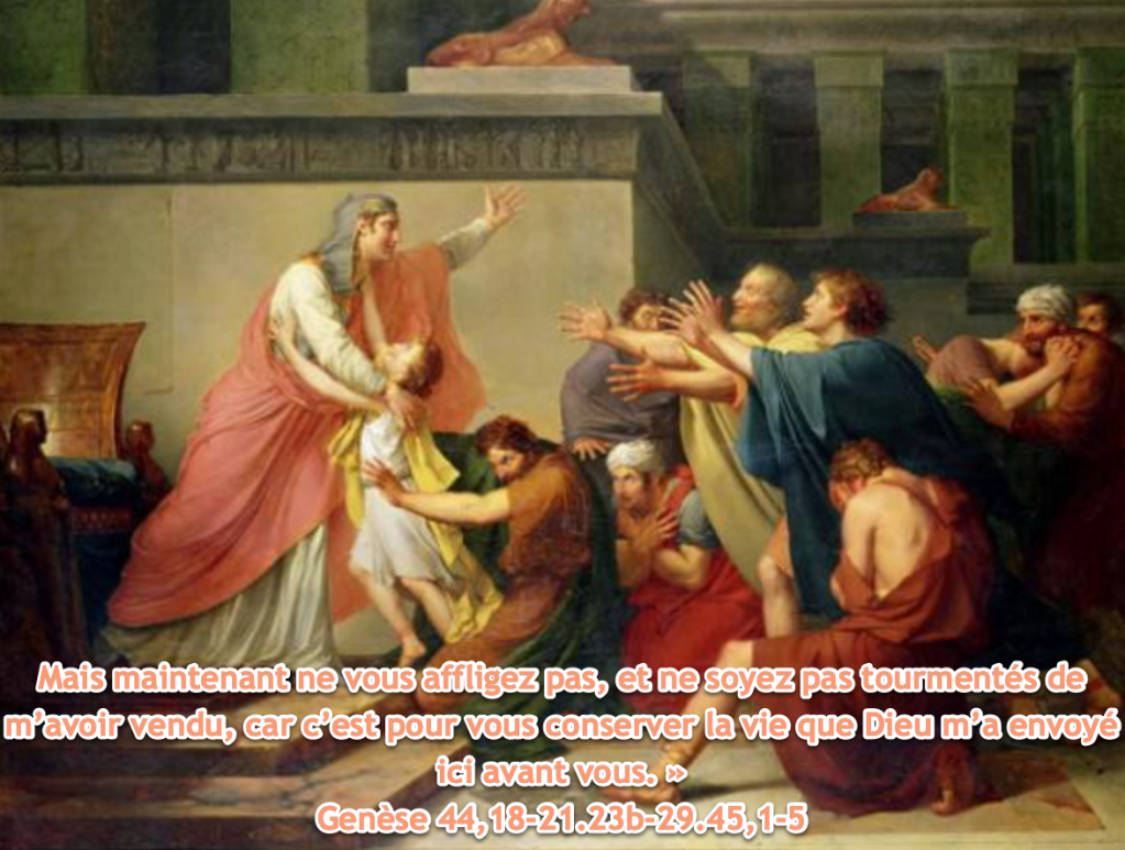 Alors Joseph dit à ses frères : « Approchez-vous de moi ». Ils s’approchèrent, et il leur dit : « Je suis Joseph, votre frère, que vous avez vendu pour qu’il soit emmené en Égypte.