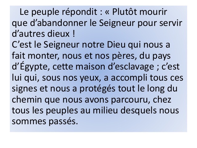 « S’il ne vous plaît pas de servir le Seigneur, choisissez aujourd’hui qui vous voulez servir : les dieux que vos pères servaient au-delà de l’Euphrate, ou les dieux des Amorites dont vous habitez le pays. Moi et les miens, nous voulons servir le Seigneur. »