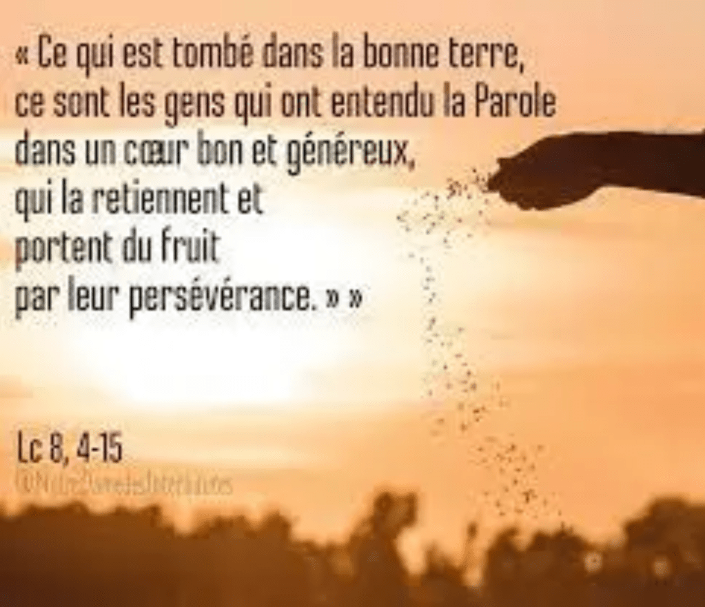 Et ce qui est tombé dans la bonne terre, ce sont les gens qui ont entendu la Parole dans un cœur bon et généreux, qui la retiennent et portent du fruit par leur persévérance. »