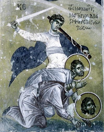 Il eut à peine fini de parler, que Sabin les condamna tous deux à être brûlés vifs. Ils allèrent avec joie au lieu de l’exécution. Ils expirèrent au milieu des flammes, en louant et bénissant le Seigneur.