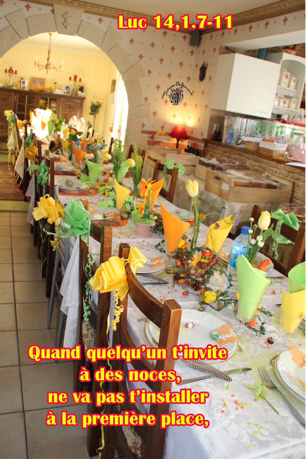 Au contraire, quand tu es invité, va te mettre à la dernière place. Alors, quand viendra celui qui t’a invité, il te dira : “Mon ami, avance plus haut”, et ce sera pour toi un honneur aux yeux de tous ceux qui seront à la table avec toi.