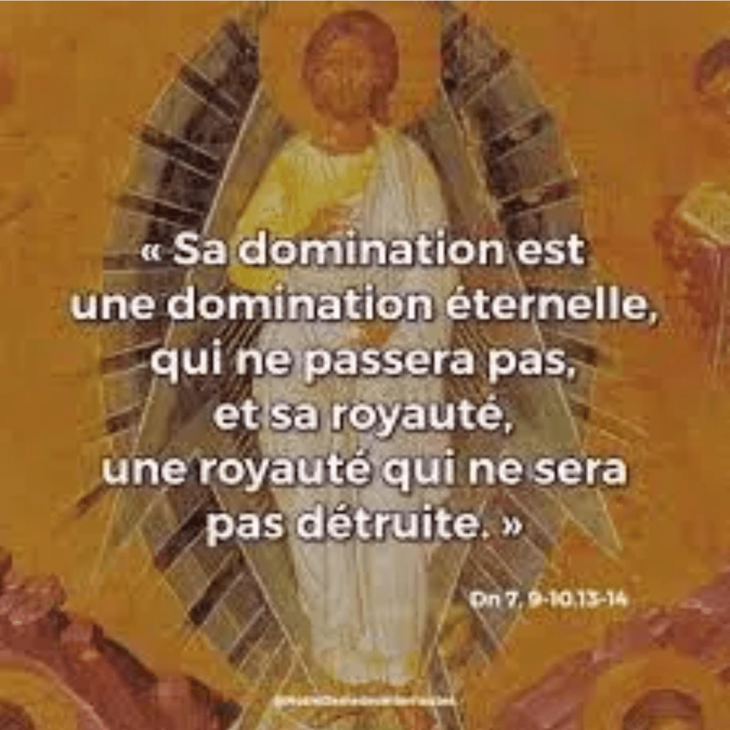 Et il lui fut donné domination, gloire et royauté ; tous les peuples, toutes les nations et les gens de toutes langues le servirent. Sa domination est une domination éternelle, qui ne passera pas, et sa royauté, une royauté qui ne sera pas détruite.