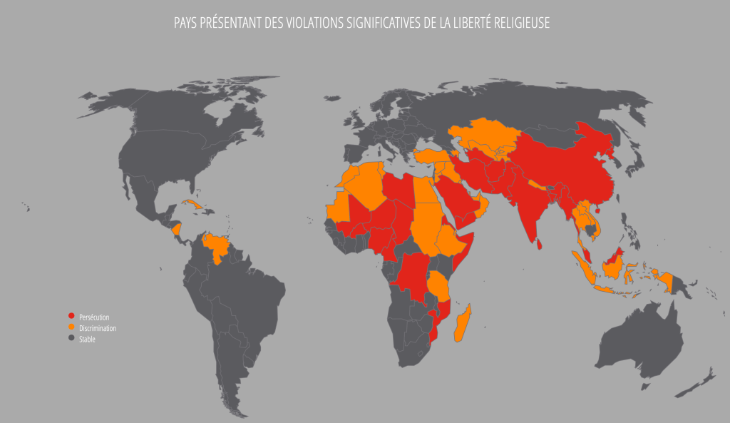 La liberté religieuse est violée dans près d’un tiers des pays de la planète (31,6 %), où vivent les deux tiers de la population mondiale. 62 pays sur un total de 196 sont confrontés à de très graves violations de la liberté religieuse. Le nombre de personnes vivant dans ces pays est proche de 5,2 milliards. Les pires violations ont lieu dans certains des pays les plus peuplés au monde comme la Chine, l’Inde, le Pakistan, le Bangladesh et le Nigeria. Le classement :
