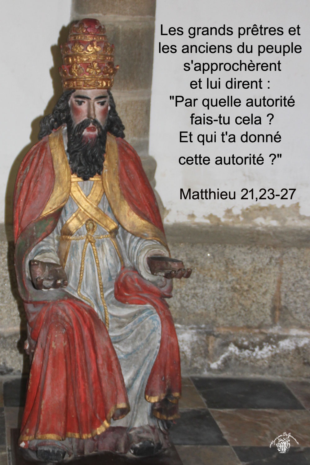 En ce temps-là, Jésus était entré dans le Temple, et, pendant qu’il enseignait, les grands prêtres et les anciens du peuple s’approchèrent de lui et demandèrent : « Par quelle autorité fais-tu cela, et qui t’a donné cette autorité ? »