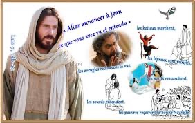 Puis il répondit aux envoyés : « Allez annoncer à Jean ce que vous avez vu et entendu : les aveugles retrouvent la vue, les boiteux marchent, les lépreux sont purifiés, les sourds entendent, les morts ressuscitent, les pauvres reçoivent la Bonne Nouvelle.