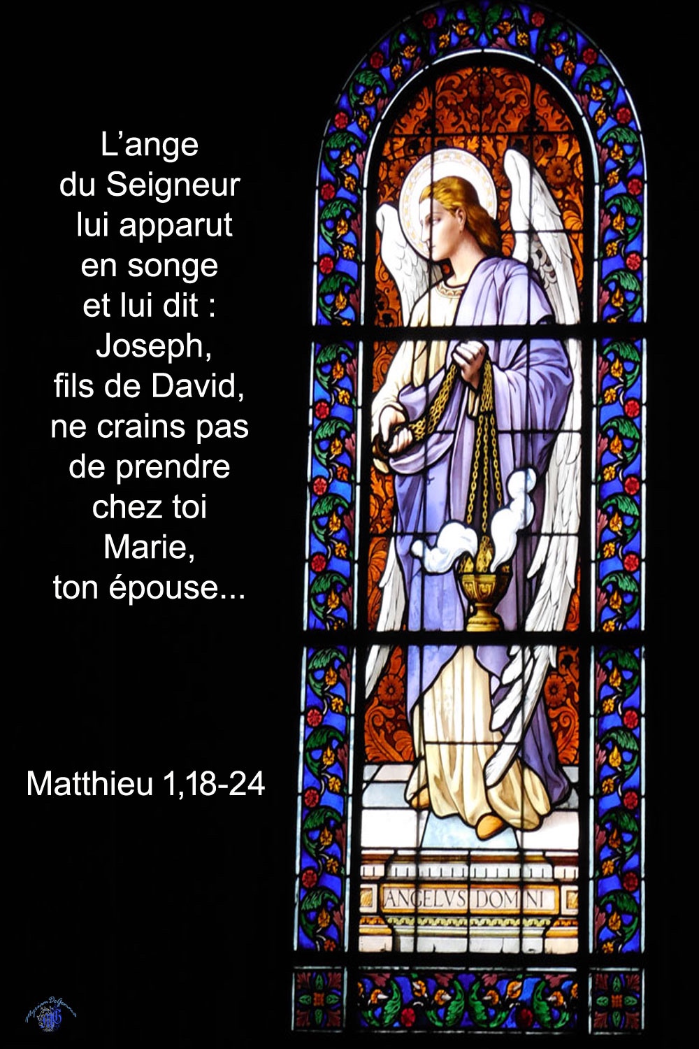 Comme il avait formé ce projet, voici que l’ange du Seigneur lui apparut en songe et lui dit : « Joseph, fils de David, ne crains pas de prendre chez toi Marie, ton épouse, puisque l’enfant qui est engendré en elle vient de l’Esprit Saint ;