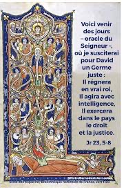 Voici venir des jours – oracle du Seigneur–, où je susciterai pour David un Germe juste : il régnera en vrai roi, il agira avec intelligence, il exercera dans le pays le droit et la justice.