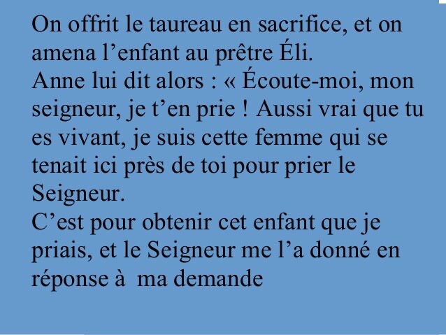 Anne lui dit alors : « Écoute-moi, mon seigneur, je t’en prie ! Aussi vrai que tu es vivant, je suis cette femme qui se tenait ici près de toi pour prier le Seigneur.