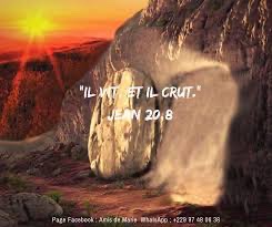 C’est alors qu’entra l’autre disciple, lui qui était arrivé le premier au tombeau. Il vit, et il crut.