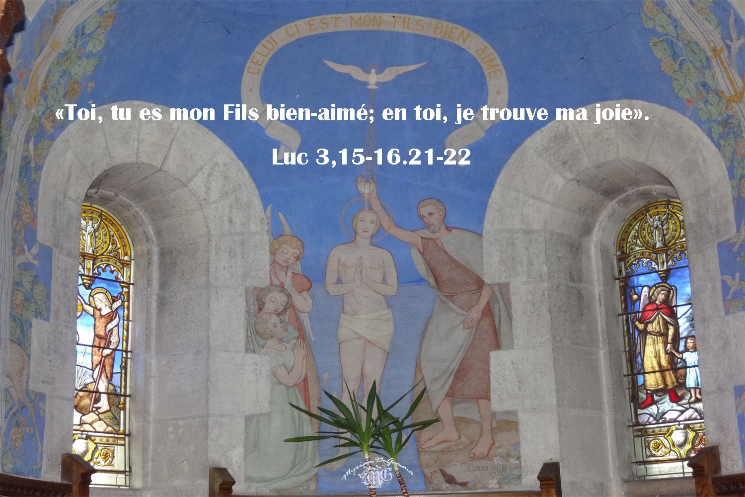 L’Esprit Saint, sous une apparence corporelle, comme une colombe, descendit sur Jésus, et il y eut une voix venant du ciel : « Toi, tu es mon Fils bien-aimé ; en toi, je trouve ma joie. »