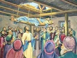 Arrivent des gens qui lui amènent un paralysé, porté par quatre hommes.
