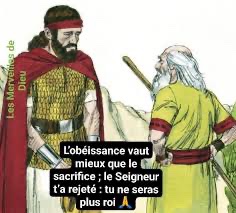 La révolte est un péché comme la divination ; la rébellion est une faute comme la consultation des idoles. Parce que tu as rejeté la parole du Seigneur, lui aussi t’a rejeté : tu ne seras plus roi ! »