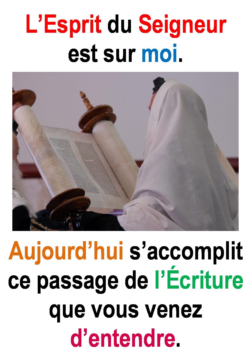 Alors il se mit à leur dire : « Aujourd’hui s’accomplit ce passage de l’Écriture que vous venez d’entendre. »