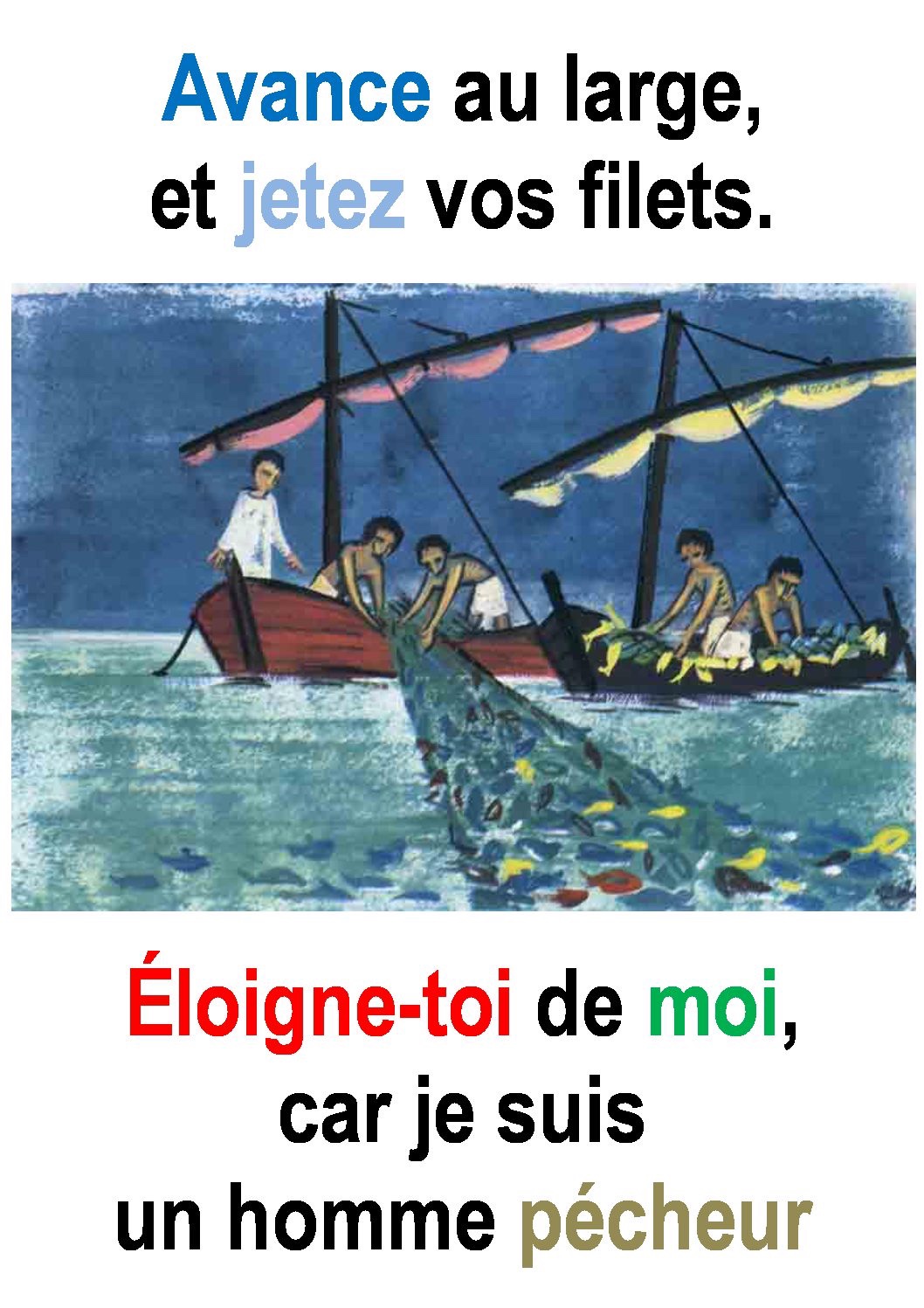 Quand il eut fini de parler, il dit à Simon : « Avance au large, et jetez vos filets pour la pêche. »