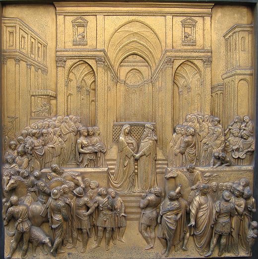 Rencontre entre le roi Salomon et la reine de Saba (scène des portes du Paradis de Lorenzo Ghiberti, XVe siècle).