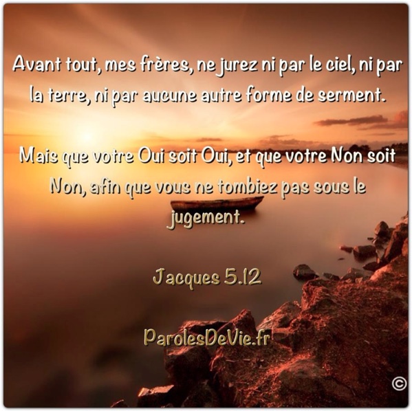 Et avant tout, mes frères, ne faites pas de serment : ne jurez ni par le ciel ni par la terre, ni d’aucune autre manière ; que votre « oui » soit un « oui », que votre « non » soit un « non » ; ainsi vous ne tomberez pas sous le jugement.