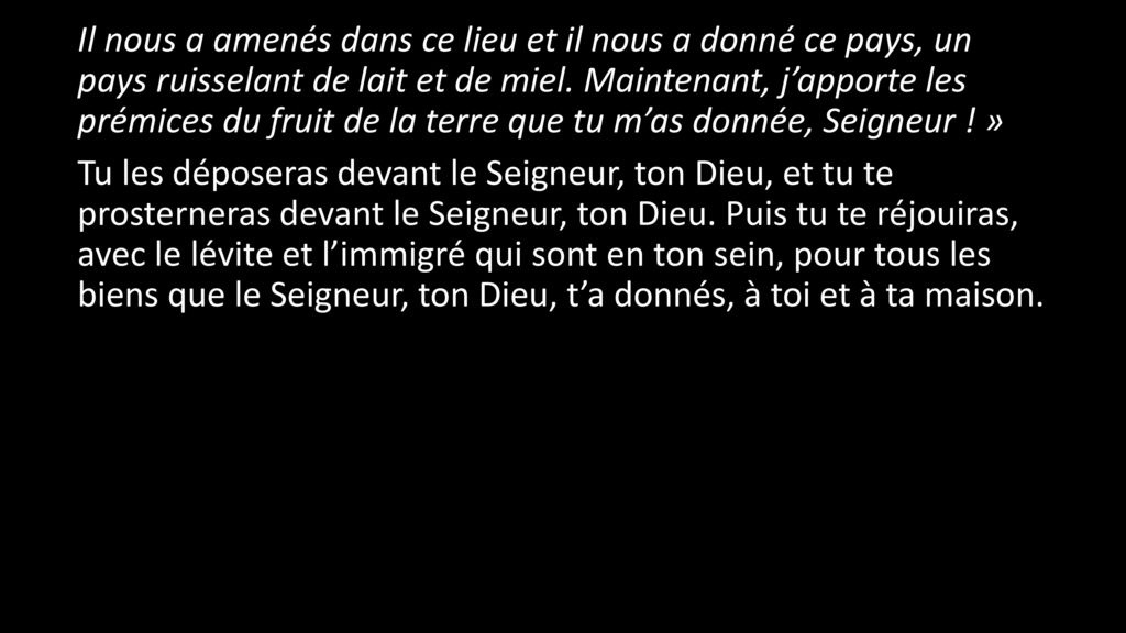 Et maintenant voici que j’apporte les prémices des fruits du sol que tu m’as donné, Seigneur. » Ensuite tu les déposeras devant le Seigneur ton Dieu et tu te prosterneras devant lui.