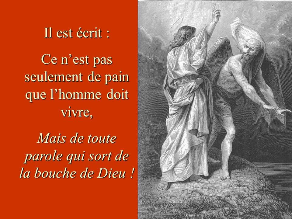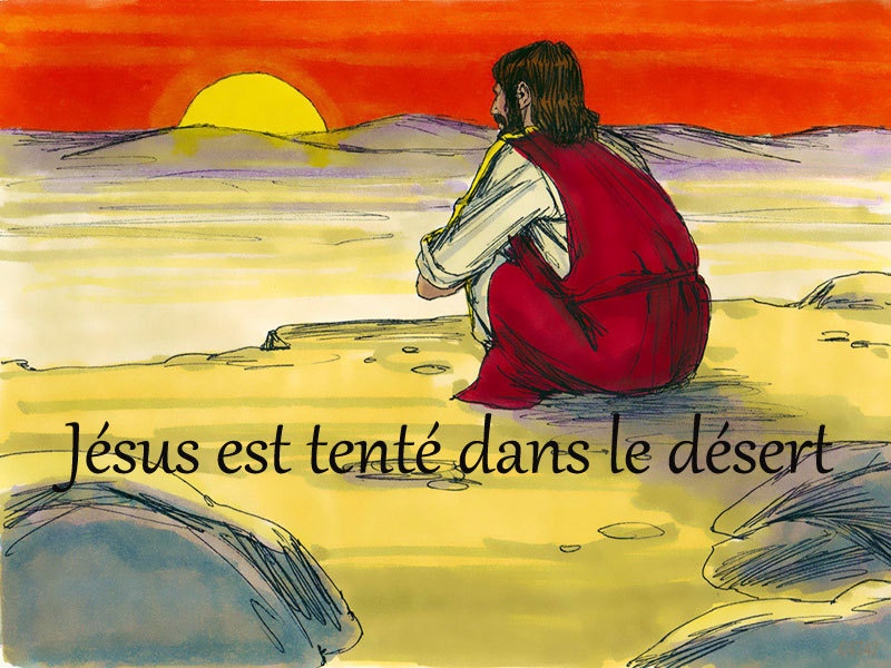 où, pendant quarante jours, il fut tenté par le diable. Il ne mangea rien durant ces jours-là, et, quand ce temps fut écoulé, il eut faim.