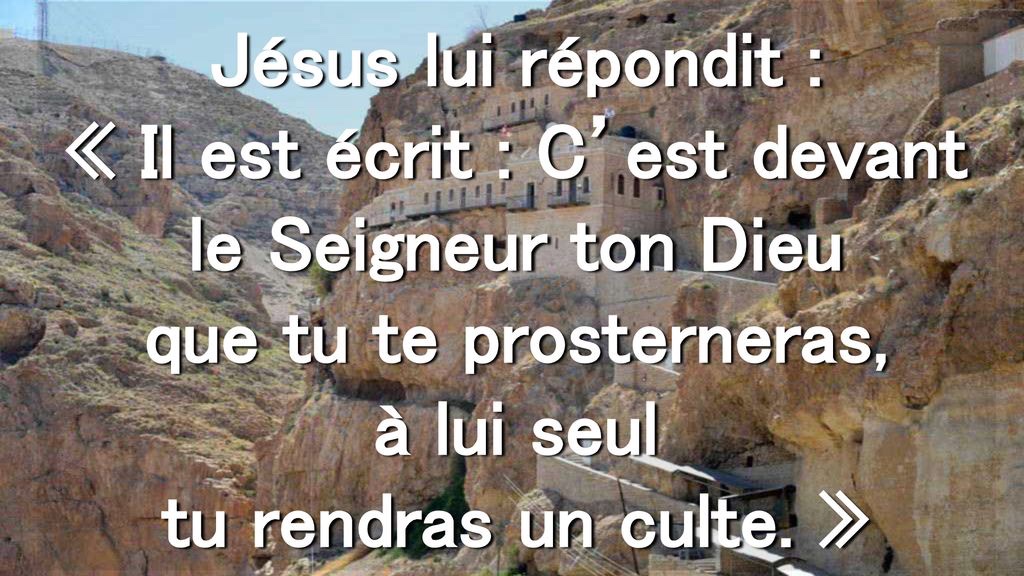 Jésus lui répondit : « Il est écrit : C’est devant le Seigneur ton Dieu que tu te prosterneras, à lui seul tu rendras un culte. »