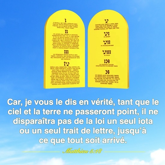 Amen, je vous le dis : Avant que le ciel et la terre disparaissent, pas un seul iota, pas un seul trait ne disparaîtra de la Loi jusqu’à ce que tout se réalise.