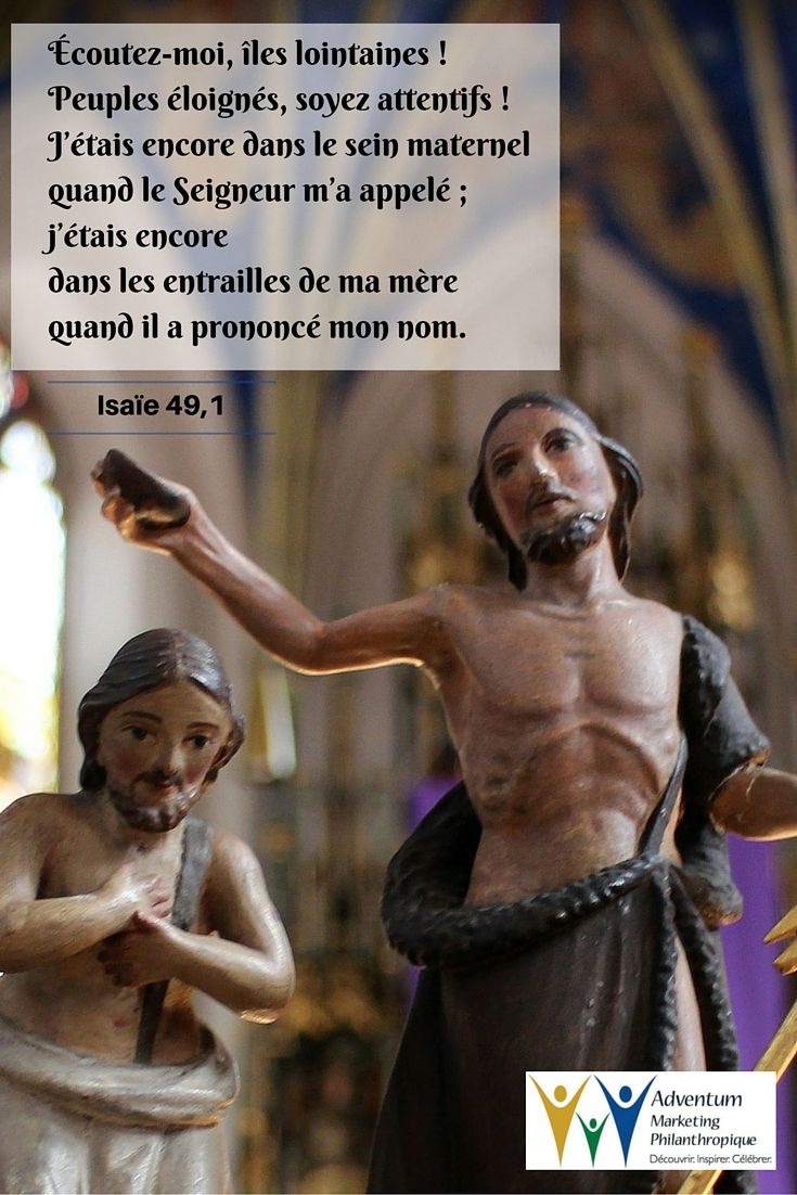Écoutez-moi, îles lointaines ! Peuples éloignés, soyez attentifs ! J’étais encore dans le sein maternel quand le Seigneur m’a appelé ; j’étais encore dans les entrailles de ma mère quand il a prononcé mon nom.