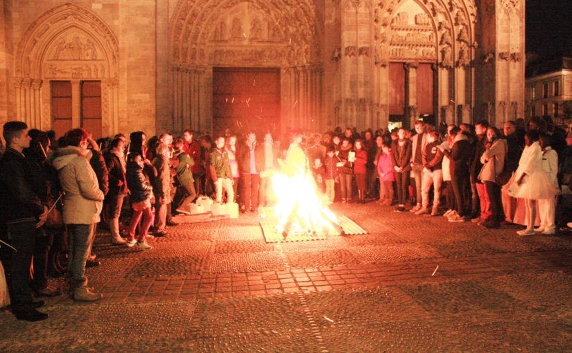 La célébration commence à l’extérieur, dans le noir. Toutes les lumières de l’église sont éteintes. Les fidèles sont invités à se rassembler autour du lieu où le bûcher a été préparé. Calmement, en silence, on allume le feu. Il est souhaitable de prendre le temps de regarder, de contempler … À l’heure prévue, le président de la célébration se rend près du feu, avec les prêtres et diacres présents ainsi que les servants dont l’un porte le cierge pascal.