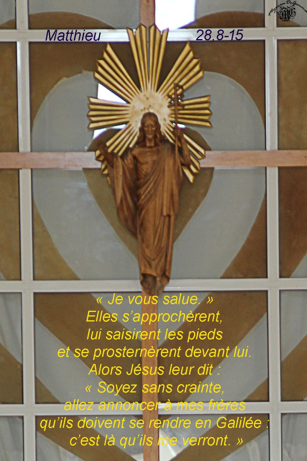 Alors Jésus leur dit : « Soyez sans crainte, allez annoncer à mes frères qu’ils doivent se rendre en Galilée : c’est là qu’ils me verront. »