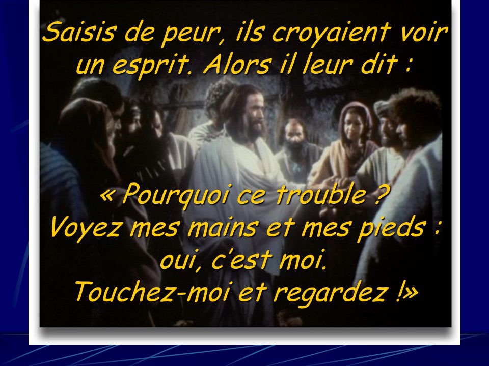 Voyez mes mains et mes pieds : c’est bien moi ! Touchez-moi, regardez : un esprit n’a pas de chair ni d’os comme vous constatez que j’en ai. »